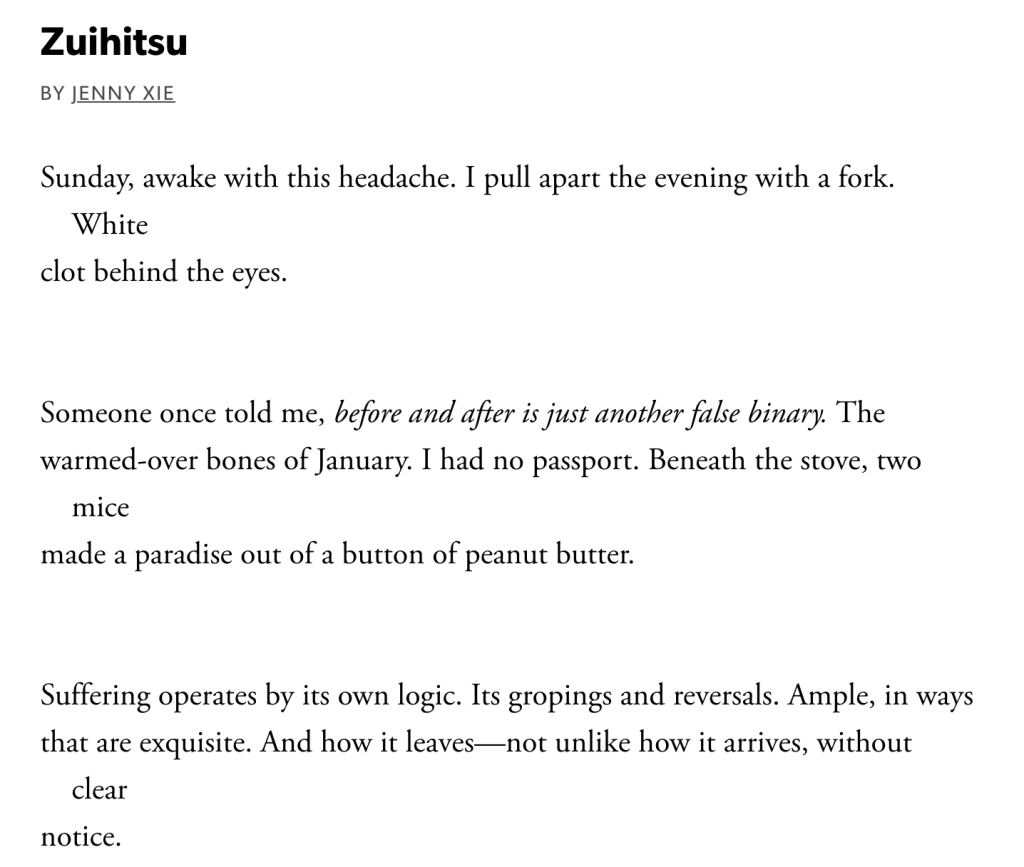 I think it is most helpful to look at examples. Here’s the beginning of a poem by Jenny Xie.
