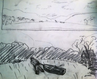 (The drawing above of a man dragging a rowboat across a field – perhaps in need of one of Neruda’s errant waves – is by Jason Martin. And, for those who don’t know, I, Manicddaily, also go by the name of Karin Gustafson.)