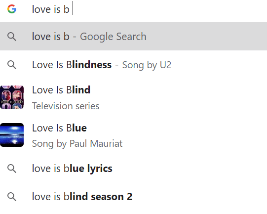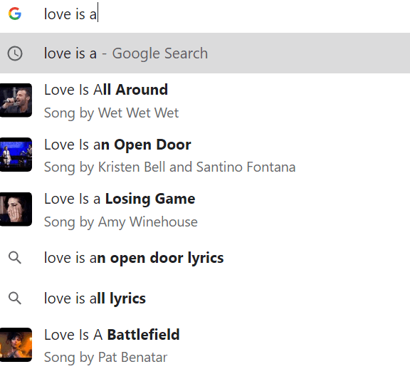 You can use this as a complete list or you might just pick one or two of the lines. For instance; Love is a battlefield. Then searching for “Love is b… ” I get:
