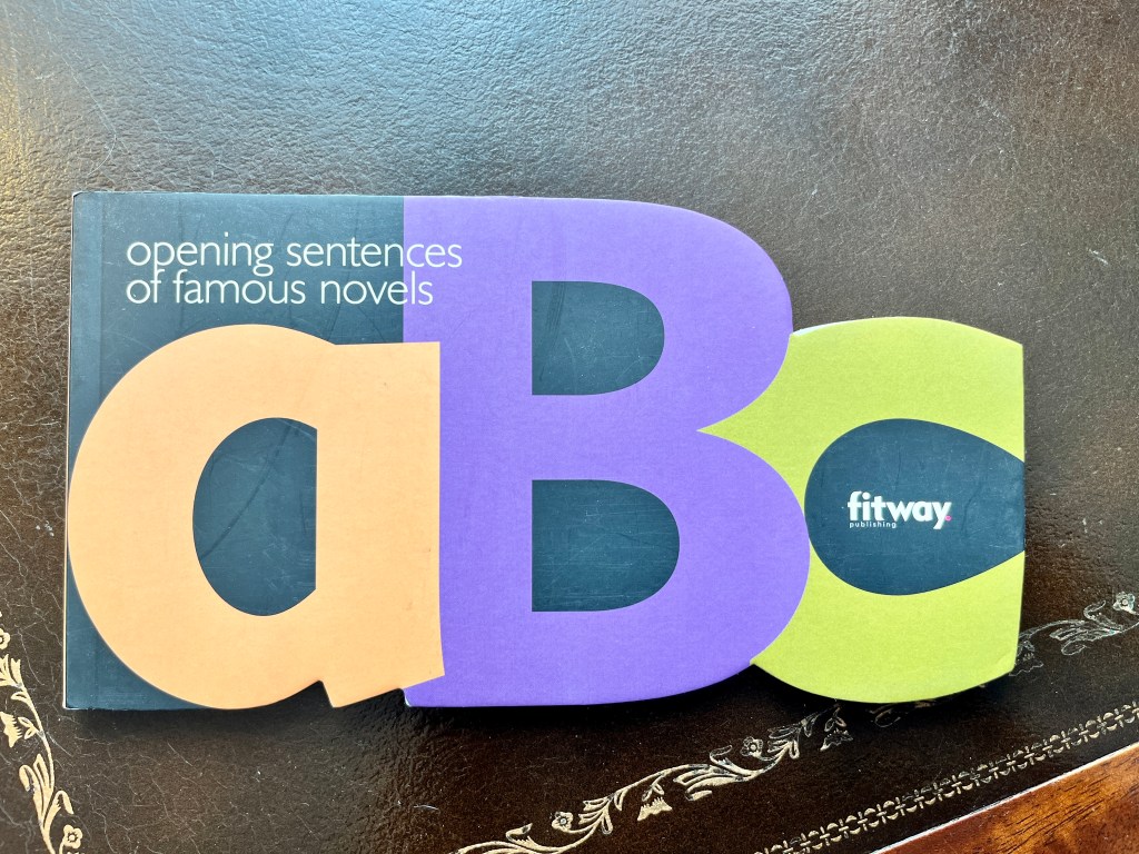 For those of you who have seen some of my previous prompts, you know I am a collector of random obscure books. I love to shop in dusty used book stores and over the years I have found some real jewels. One such book is the inspiration for today’s prompt. It is a small die cut book and the title is Opening Sentences of Famous Novels, by Leon Mazzella, published by Fitway Publishing. On each page is an opening sentence and the author’s name. You can then try to guess what book it came from, and in the back are the bibliological references to check if you are correct. It’s a fabulous little book!