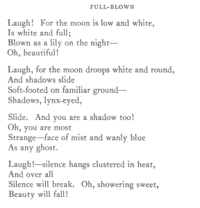 In “Full Blown” – Marion Strobel’s 8/4 syllabic alternate rhyme poem – she employs many pauses and stops, and effectively inhibits the rhymes’ rhythmic rut.
