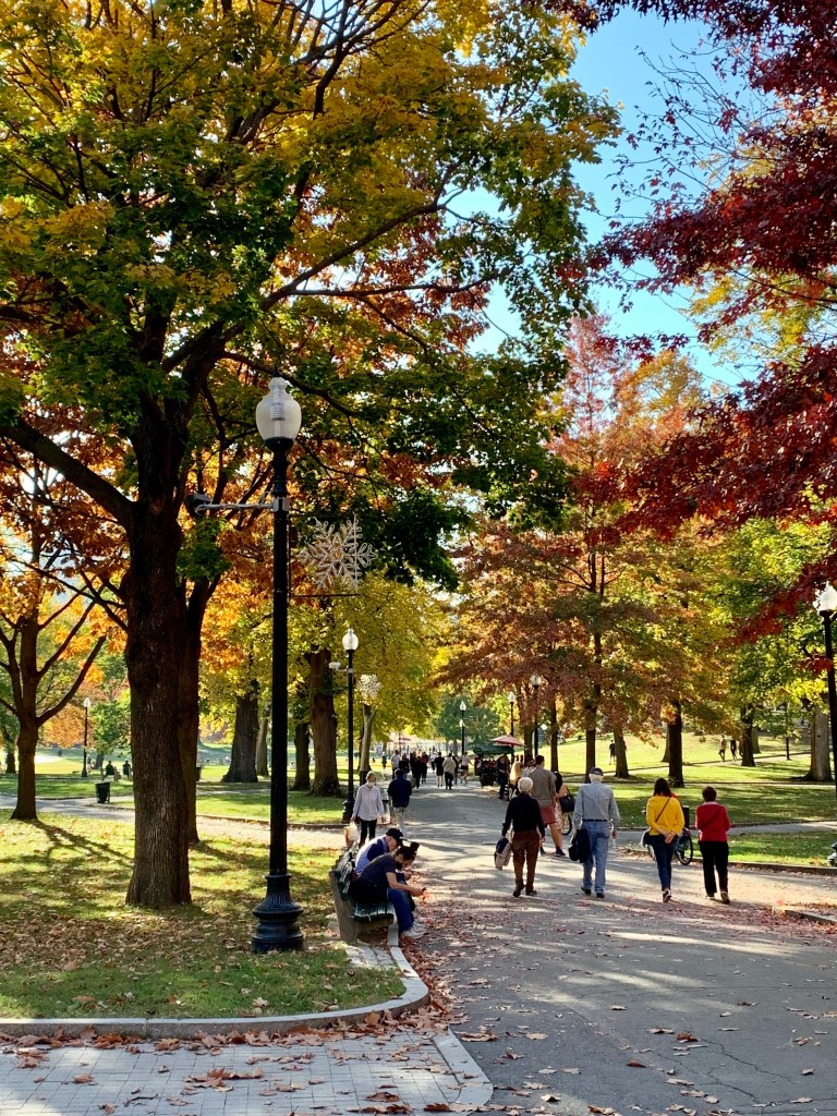 I moved to Boston in 1997, after being raised in Illinois and raising our family in Iowa. In our first few years here, we managed to be resident tourists as well as start new jobs and settle in. We have been carless since 1997, and literally walk and/or take public transportation all over the city and beyond. Two of my favorite places to walk are the Boston Commons, established in 1634 and the Public Garden, across the street from the Commons, established in 1837. The Garden boasts beautiful walkways, many trees and plants, and a lagoon which hosts the famous Swan Boats during summer months. Struggling to find a word for today’s prompt (there’s so many possibilities!), I decided to stroll through the Public Garden to marvel at the beauty of autumn. Many of the trees were incredibly vibrant!