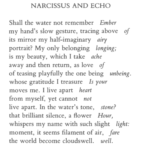 Delmore Schwartz, echo, Fred Chappell, ghazal, Narcissus, Pablo Neruda, Pura López-Colomé, refrain