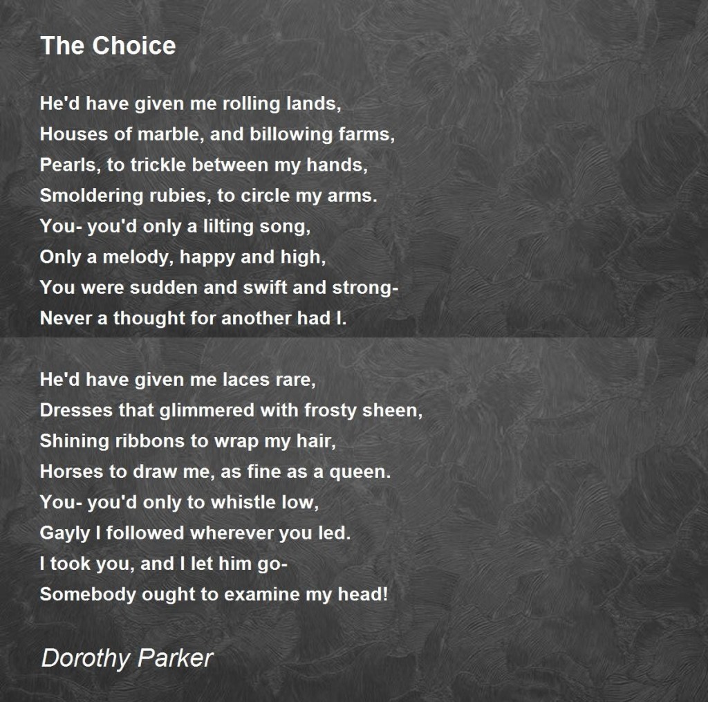 Dorothy Parker pens us this poem about two diverging paths and the one she chose.