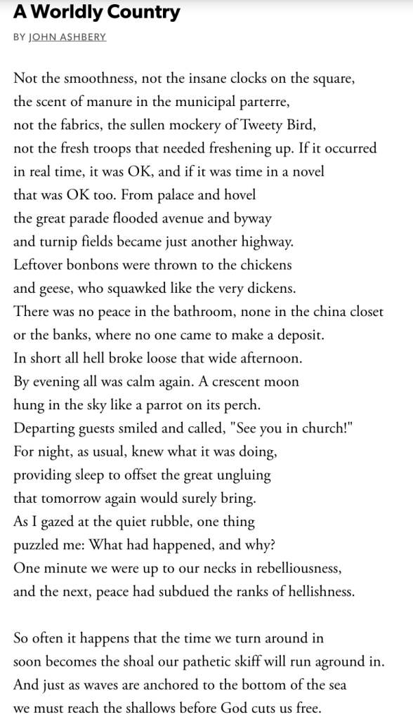 John Ashberry’s “A Worldly Company” couches a simile smack dab in the center of his poem so that it hangs illuminatingly over the whole. Coleridge’s Inscription for a Fountain on a Heath centers his simile so that it delightfully impresses on what precedes and follows.