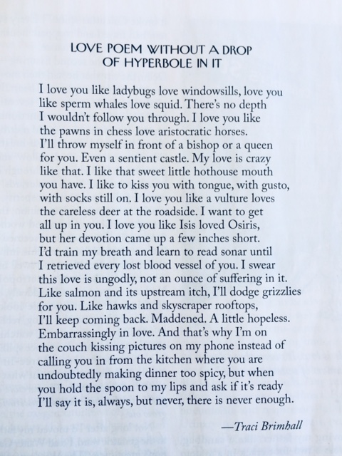 Similes can run rampant throughout a poem like Traci Brimhall’s “Love Without a Drop of Hyperbole In It.”